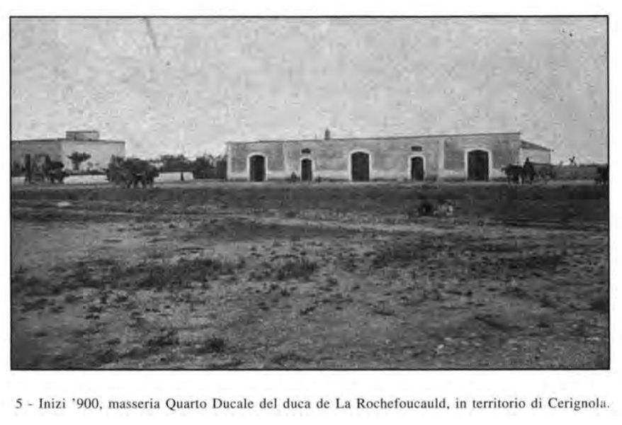 Il centro dell'organizzazione produttiva del territorio cerignolano era rappresentato dalla masseria, sede della grande e media proprietà terriera, punto di riferimento obbligato per la maggior parte della popolazione, costituita da una massa di contadini poveri che, pur disponendo a volte di piccole quote di terra da coltivare in proprio, svolgevano la loro attività prevalentemente come lavoratori giornalieri o come salariati fissi. E nella masseria, che nella Capitanata si identifica propriamente con la grande azienda cerealicola o cerealicolo-pastorale di tipo estensivo, con superfici spesso superiori ai 200 ettari e con tutto il complesso di impianti e fabbricati di cui la stessa azienda è costituita, i lavoranti erano organizzati secondo precise gerarchie di grado e funzione, sotto la guida generale del curatolo, responsabile di tutta l'organizzazione dei servizi e dell'andamento dei lavori.