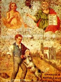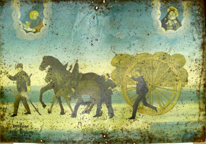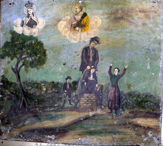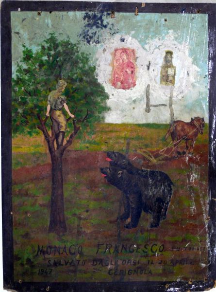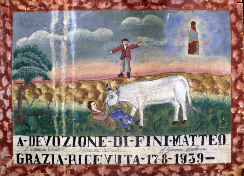 Le tavolette di incidente, come abbiamo precedentemente accennato, presentano una casistica molto varia. Per tutto l'Ottocento predominano gli incidenti di carretto e le cadute da carretto o da cavallo. Tavoletta votiva n. 353 del 1924 - Incidente di carrettoLe tavolette del Santuario offrono un'ampia descrizione di carri di vario tipo, dal carretto semplice utilizzato per usi agricoli al biroccio, dal carro coperto al calessino signorile. Ci sono anche molti esemplari raffiguranti i grandi carri coperti usati dai pellegrini per recarsi al Santuario. E, naturalmente, sono documentati vari tipi di finimenti e bardature, che cambiano non solo da regione a regione, ma anche da area ad area nell'ambito della stessa regione. Il basto può infatti essere appuntito o arrotondato, semplice e doppio e così via. Un gruppo abbastanza numeroso è costituito dalle tavolette che si riferiscono a cadute in pozzi e cisterne. Il discorso a questo punto si amplia e coinvolge la struttura della casa rurale, della masseria e di tutte le strutture che intorno ad essa gravitano: la corte per gli animali, l'aia, il capanno adibito a deposito degli attrezzi e naturalmente il pozzo che può trovarsi sia all'interno della casa stessa, per usi esclusivamente domestici, che all'esterno per un'utilizzazione più varia: abbeverata, irrigazione. La cisterna, a sua volta, può essere utilizzata per contenere non solo acqua, anche il vino nei periodi di fermentazione. La tavoletta votiva n. 124Un altro gruppo molto numeroso è costituito da tavolette che rappresentano morsi e assalti da parte di animali, in particolare cani, cavalli e mucche. È il gruppo che più direttamente si collega al culto e al patrocinio di S. Matteo, protettore degli animali, ma anche difensore degli uomini dal loro assalto. Le tavolette più antiche si riferiscono a morsi di cani, grossi cani da pastore dal pelo bianco e dai lunghi denti aguzzi temutissimi dai contadini; più tardi si affiancano e si sostituiscono morsi e calci di cavalli e di mucche, fino a giungere al caso limite di un assalto da parte di due grossi orsi che costringono il malcapitato che li ha incontrati a rifugiarsi sopra ad un albero: Monaco Francesco fu Tommaso salvato dagli orsi il 20 Aprile 1947 Cerignola Dal 1960 in poi aumentano notevolmente gli incidenti d'auto: dapprima sono incidenti emblematici di un periodo di transizione di forzata convivenza di mezzi a trazione animale con mezzi meccanici (cavalli imbizzarriti che all'apparire di un pullman o di un'auto si impennano e fanno ribaltare il carretto); poi scontri tra mezzi meccanici o incidenti stradali. Tavoletta votiva n. 378 del 1931 - Incidente di carrettoAnche gli incidenti occorsi sul lavoro sono numerosi: cadute da trebbiatrici o falciatrici, contadini trascinati dal braccio di una motozappa, cadute da impalcature, ferite subite in piccole fucine, in segherie, in ombrose radure durante il taglio dei boschi e infine, negli anni più recenti, incidenti in cantieri edili, in grandi fabbriche, perfino in miniere. Molti di questi ultimi sono ex-voto di emigranti e provengono soprattutto da Francia, Germania e Belgio. Tavoletta votiva n. 94 - Ustione nell'accensione del fuocoAlcune tavolette di incidenti ci illuminano su usanze particolari vigenti nell'ambito rurale della zona: casi di ustioni provocate dal braciere, casi di asfissia causati dall'abitudine di conservare accesa la brace anche durante la notte, casi di ustioni da acqua bollente quando si usava fare il bucato in casa in un'enorme tinozza colma di liscivia bollente, incidenti causati dall'uso di tenere in cucina o nella stanza d'ingresso (e spesso nella casa rurale le due cose coincidono, e la cucina è divisa dal resto della stanza solo per mezzo di una tenda) il fucile carico. Oltre, naturalmente, a tutta una serie di usanze d'altro genere come l'uso di tenere in camera da letto i santi sotto la campana di vetro, o di scaldare il letto col “monaco”, sorta di impalcatura in legno, dentro la quale veniva sistemato lo scaldino, che si introduceva sotto le coperte; o di apporre alle pareti immagini sacre, sia in casa che negli ambienti adibiti a ricovero per gli animali. La casistica sarebbe infinita; è preferibile, quindi, rimandare le osservazioni particolari alla parte nella quale vengono analizzati alcuni campioni di tavolette votive particolarmente interessanti. Tavoletta votiva n. 418Lo schema compositivo della tavoletta votiva comprende alcuni elementi essenziali - apparizione, dicitura, paesaggio - che esamineremo singolarmente, e un certo modo di rappresentare l'evento miracoloso che, al di là del legame all'antico formulario di cui tutti i pittori di ex-voto si sono serviti e si servono (apparizione in un angolo superiore o al centro, miracolato in primo piano, particolare gerarchia delle proporzioni tendente ad evidenziare l'elemento importante della scena) può privilegiare alcuni particolari rispetto ad altri. Nel mondo contadino, per esempio, gli animali, domestici o da cortile, hanno un'importanza primaria; in scene che rappresentano incidenti occorsi all'esterno della casa rurale non mancano mai il cane alla catena, le galline, la stalla. Tavoletta votiva n. 360 - Interno di una casaAll'interno della casa sono invece rappresentati sia tutti gli elementi dell'arredamento (fino al televisore, indice di un certo ceto sociale) sia tutte quelle suppellettili o ornamenti che fanno parte integrante della casa rurale stessa: i quadri sacri alle pareti, la palma benedetta infilata nella cornice, la roncola appesa sopra il camino, la piccola statua sacra, circondata dalle ghirlande di fiori di carta e posta sotto una campana di vetro sul comò. Il pittore mediante la rappresentazione dei particolari della casa cerca di evidenziare anche la personalità del miracolato. Al momento della committenza della tavoletta votiva, infatti, il miracolato racconta al pittore l'evento di cui è stato protagonista lasciandogli il compito di rappresentarl