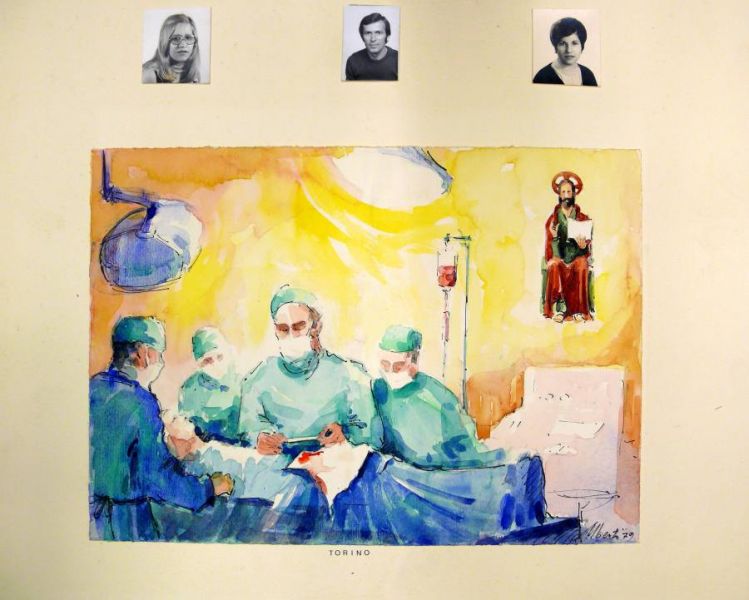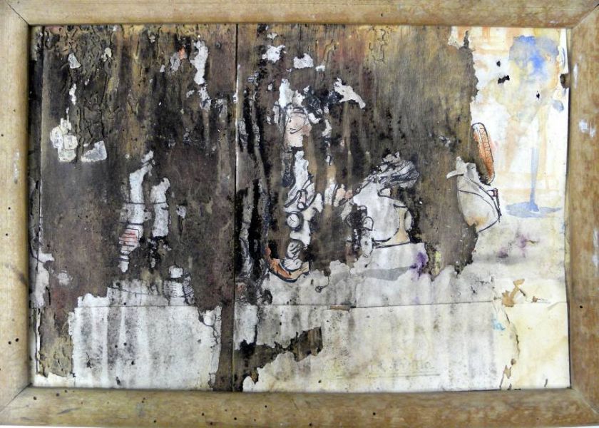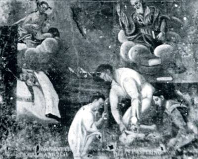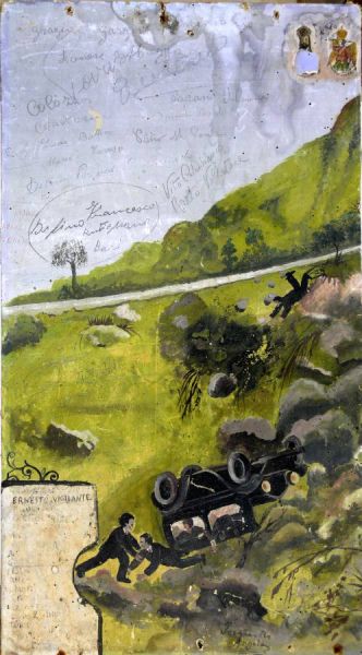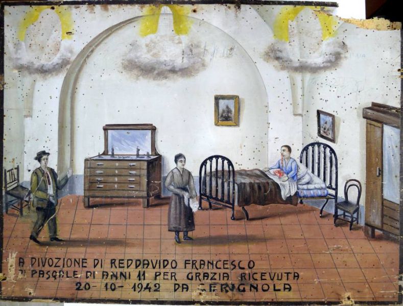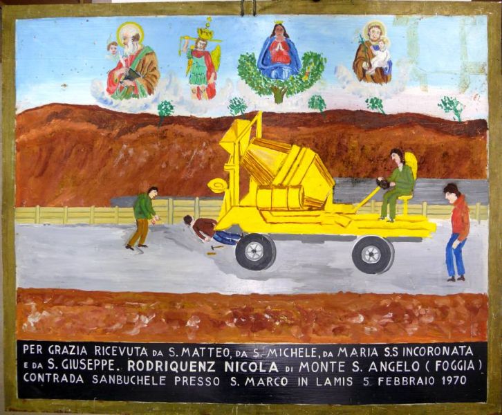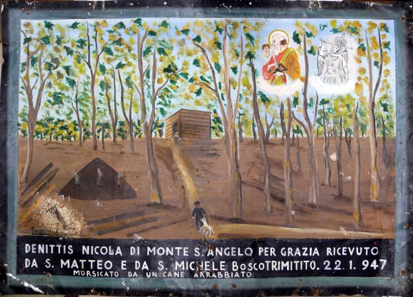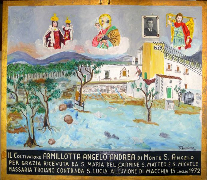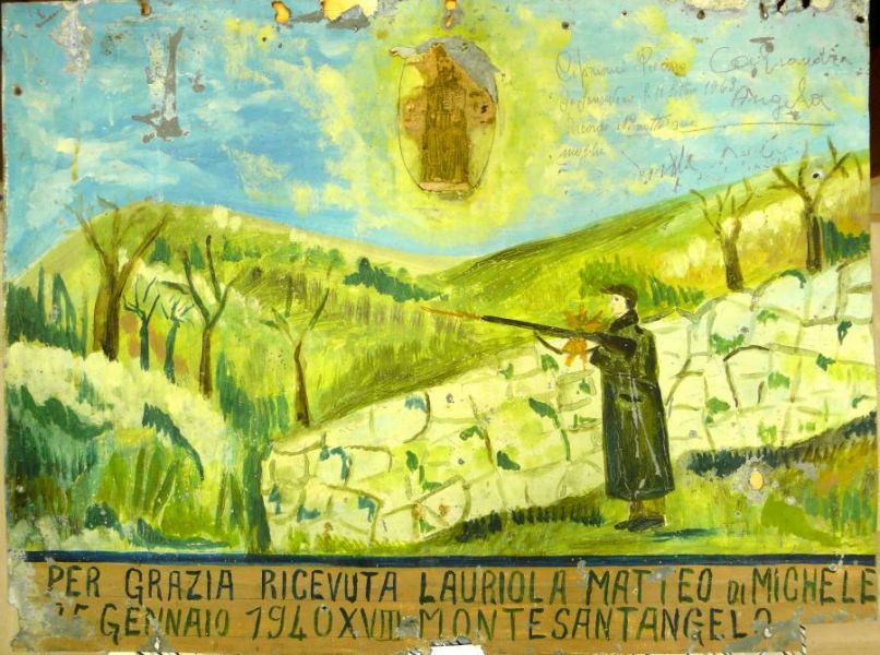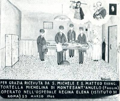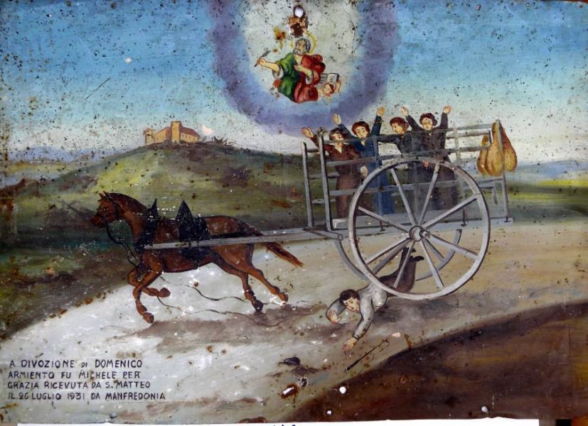 Tavoletta votiva n. 234 completamente rovinataLe tavolette votive conservate nel Santuario di S. Matteo sono oltre cinquecento e vanno dal 1851 (tavoletta più antica datata) ai giorni nostri (1980). L'uso comunque risale certamente a tempi più remoti: basti pensare, oltre che alla solidità del culto, al sito in cui il Santuario sorge che, come si è detto, è proprio a metà della via sacra, di pellegrinaggio e di preghiera, che da Monte S. Angelo, attraverso stazioni più o meno famose, giunge fino a Bari. Una tradizione quindi secolare, documentata dalle varie Cronache e, quel che più conta, continua nel tempo fino ai giorni nostri. Lo stato di conservazione generale delle tavolette non è ottimale ma il paziente lavoro di restauro dei frati francescani ci ha permesso almeno di prendere visione dei più antichi e, sotto certi aspetti, più interessanti esemplari. La materia è varia: tela e legno per le tavolette più antiche, lamina di ferro e di zinco e, per gli esemplari più recenti, compensato, masonite e cartoncino. La tecnica impiegata, che è condizionata dalla materia usata, va dall'olio alla tempera, all'acquerello fino al semplice disegno a matita. La grande quantità di tavolette votive e la loro varietà hanno permesso un'analisi comparativa che spazia in molti campi: dall'iconografia allo schema compositivo, dall'arredamento al costume, fino all'individuazione di vari stili pittorici e di alcune botteghe artigianali. Tavoletta votiva n. 394 del 1931 - Incidente di lavoroDelle tavolette conservate attualmente nel Santuario, circa quattrocento sono rappresentazioni di incidenti; una cinquantina rappresentano malattie, cinque aggressioni, otto naufragi, tre sono rappresentazioni di guerra, due si riferiscono a calamità naturali, quattro a guarigioni di animali e sei nelle quali il tipo di miracolo rappresentato non si può desumere dalla scena né dalla dicitura. All'interno di questa classificazione si possono però individuare altre suddivisioni; nell'ambito degli incidenti, ad esempio si può distinguere tra incidenti di carretto, che hanno caratterizzato tutto l'Ottocento ed il primo Novecento, incidenti d'auto, che si fanno prevalenti dagli anni '60 in poi, incidenti sul lavoro (agricoli e in fabbrica o miniere), cadute da alberi, da cavallo, in pozzi o cisterne, da treni ecc.; morsi o assalti da parte di animali (cani, cavalli, mucche), incidenti di caccia e così via. Lo stesso dicasi per le tavolette che rappresentano malattie: malattie generiche, casi di emottisi, interventi chirurgici. Tavoletta votiva n. 244 del 1942 - MalattiaLe tavolette di malattia sono sempre state un ottimo spunto per lo studio dei metodi di cura delle varie malattie, nonché dell'incidenza di alcune malattie. Anche nel Santuario di S. Matteo ce ne sono alcune validissime ed interessanti da questo punto di vista. In due, datate rispettivamente 1851 e 1926, sono rappresentati dei salassi, eseguiti mediante un'incisione praticata ad un arto. In altre sono documentate crisi di emottisi, malattia frequentissima per tutto il secolo scorso, con casi isolati fino alla metà del 1900, considerata in alcuni ambienti ed in alcune regioni una vera e propria malattia sociale. Tavoletta votiva n. 434 del 1979 - Intervento chirurgicoDal secondo dopoguerra si intensificano gli interventi chirurgici, di cui le tavolette ci danno documentazioni drammatiche e talvolta realisticamente cruente, illuminanti però per le descrizioni delle sale operatorie e dei vari strumenti chirurgici, visti spesso con l'occhio di chi conosce per sentito dire o immagina solamente, ma qualche volta descritti con estrema precisione. Molti esemplari si riferiscono ad interventi eseguiti presso l'Ospedale 'Casa Sollievo della sofferenza' di S. Giovanni Rotondo, sotto il patrocinio di Padre Pio, che compare accanto all'apparizione di S. Matteo. Nella dicitura, anzi, viene spiegato, più o meno esplicitamente, che l'esito dell'intervento è stato positivo più per l'influsso del santo, che ha guidato la mano dei chirurghi, che per perizia degli stessi. Tavoletta votiva n. 452 - NaufragioI naufragi sono pochi, appena otto, come abbiamo detto. E d'altra parte i marinai hanno altri protettori: la Madonna della Libera venerata a Rodi Garganico, la Madonna di Loreto venerata a Peschici, la Madonna di Siponto e Sant'Andrea (patrono per eccellenza dei marinai) venerati a Manfredonia. I pochi conservati, comunque, si riferiscono a pericoli corsi durante la pesca da piccole barche isolate o da pescherecci per la pesca d'alto mare, come si desume dalle diciture e dalle scritte apposte sulla tavoletta stessa e che indicano le rotte comprese tra le Tremiti e le isole dalmate di Lissa, Pianosa e Pelagosa (volgarizzata in Palacosa o Pielagosa). Tavoletta votiva n. 295 - L'alluvione del 1972Due tavolette si riferiscono a calamità naturali che hanno colpito la Capitanata rispettivamente agli inizi del secolo e nel 1972: sono rappresentazioni di alluvioni, localizzate la prima in un'ampio tratto brulicante di case coloniche e di persone (in pericolo e soccorritori a cavallo) e la seconda in un'azienda agricola completamente inondata dalla piena delle acque. Alcune tavolette rappresentano guarigioni di animali, soggetto in perfetta coerenza con il patrocinio di S. Matteo e con l'usanza, ancora viva, di ungere gli animali con l'olio di S. Matteo per preservarli da malattie ed epidemie. Un tempo gli animali venivano condotti al Santuario per essere benedetti ed unti, ora è un frate questuante che gira per le campagne con la boccetta dell'olio santo. La tavoletta votiva n. 51E pare, anzi, che ciò che è valido per gli animali sia valido anche per le persone, a giudicare dalla dicitura di una tavoletta di malattia, che rappresenta la guarigione di una bambina, che dice testualmente: La bimba di 15 mesi Savastano Angioletta di Matteo benedetta dal frate questuante coll'olio di S. Matteo riceve la grazia l'8 Marzo 1934 - Monte S. Angelo Tornando alle 