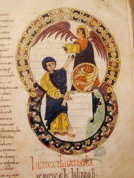 Biblioteca del convento di s. Matteo a S. Marco in Lamis - Foto del 2001Con quali strumenti lavora il miniatore? Le fonti ci restituiscono un arsenale impressionante: penne, squadri, righe e compassi; stilo di piombo per l’abbozzo del disegno; mollica di pane e raschietti per cancellare; coltelli per temperare le penne, tagliare le foglie d’oro e d’argento, grattare via le polveri dei colori; filtri di tessuto, colatoria, per chiarificare i liquidi o separare i colori da soluzioni depuranti; mortai e pestelli di porfido, di bronzo o d’oro per la macinazione dei colori minerali; vasi e ampolle di vetro o terracotta, corni di bue, sacchetti di cuoio, gusci di tartaruga o conchiglie, tavolozze. I pennelli più adatti alle miniature erano fatti con i peli della coda del vaio o scoiattolo, riuniti e legati in un cannello di penna di avvoltoio o d’oca, di gallina o di colombo, a seconda della grandezza desiderata. La biblioteca di BabeleI colori sono in genere composti da pigmenti uniti a leganti. I pigmenti possono essere artificiali, ottenuti per reazioni chimiche, come il cinabro, oppure naturali, minerali allo stato puro o estratti vegetali. Una volta approntati gli strumenti, i colori e il supporto, il miniatore può finalmente cominciare a lavorare. Per riempire gli spazi lasciati vuoti sulla pagina dispone, oltre che dei repertori di motivi e scene accumulati nella sua memoria o raccolti nei taccuini e libri di modelli, di una serie di guide molto precise. Spesso ha davanti un esemplare che deve riprodurre: come per i testi, copiare era una regola anche per le illustrazioni. I committenti possono fornire al miniatore un vero e proprio brogliaccio o una maquette dove siano indicati il layaut (sic!) e i soggetti delle illustrazioni. Nella maggior parte dei casi le istruzioni per il miniatore si trovano all’interno dello stesso manoscritto su cui deve intervenire: si tratta di annotazioni scritte, cifrate o schizzate nei margini dei fogli, venivano erase o tagliate al momento della legatura, o negli spazi destinati ad essere coperti dalla decorazione. Altri promemoria per i miniatori sono i disegni sommari preliminari o le cifre che fissano il numero e il tipo di iniziali da eseguire in ciascun fascicolo, annotandone a volte anche il prezzo, o i motivi scelti per tappezzare gli sfondi. Alla fine del lavoro il miniatore può a ben diritto affidare la sua memoria alle firme e sottolineare la fatica dell’impresa. [Ermeterius si ritrae insieme allo scriba Senior e a un anonimo pergamenario mentre in una stanza della torre campanaria del monastero di Tavara, lavora alla decorazione del Commento all’Apocalisse del Beato di Liebana terminata nel 970, e sottolinea la fatica dell’impresa durata tre mesi: