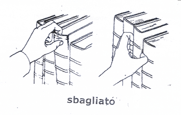 Conservazione Alcune semplici regole per conservare i libri. - Catalogazione: - Pulizia e normale manutenzione; - Regole per maneggiare i libri; - Luce, temperatura, ventilazione e umidità 1 - Catalogazione Biblioteca del convento di s. Matteo a S. Marco in Lamis - Foto del 2000Ogni libro deve essere catalogato e descritto in una propria scheda. Gli elementi essenziali della catalogazione sono: - Titolo e autore; - Editore, anno di stampa, numero dell’edizione, numero della copia e nome della collana editoriale (se presente); - Formato e numero di pagine; - Numero e tipi di illustrazioni (es. incisioni, disegni, xilografie, foto …) e autore delle stesse; - Caratteristiche della rilegatura (brossura editoriale, rilegatura artigianale …); - Argomento trattato (es. letteratura, saggio, narrativa …); - Provenienza; - Data della catalogazione; - Note sul suo uso; - Note sullo stato di conservazione; - Note varie (es. valore, appartenenza …); - Posizione nella libreria o collocazione (numero di libreria, scaffale …). Biblioteca del convento di s. Matteo a S. Marco in Lamis - Foto del 20002 - Pulizia e normale manutenzione Le operazioni di normale pulizia dovrebbero essere eseguite almeno due volte l’anno se i volumi sono in librerie protette da vetri, più spesso se in librerie aperte. Il modo di procedere dovrebbe essere il seguente: - Togliere tutti i libri di uno scaffale; - Visionare lo scaffale per vedere se ci sono tracce di infestazione di insetti, polvere di legno, di carta … ; - Pulire dalla polvere i libri e visionarli internamente per scoprire eventuali infestazioni di insetti; - Riporli nello scaffale nello stesso ordine che avevano precedentemente. Pulire dalla polvere Mai sbattere un libro contro l’altro. Afferrato saldamente il libro dal dorso e facendo pressione con le dita per tenerlo chiuso (per evitare che la sua polvere entri al suo interno), spazzolare con un pennello di setole (ottimo quello da barba) la testa, cominciando dal capitello e procedendo verso il taglio. Aprendo poi i piatti di un angolo non superiore ai 90°, togliere anche la polvere penetrata all’interno delle copertine. Se la polvere è penetrata all’interno delle pagine, bisogna spazzolarle una per una. Per evitare tensioni e possibili danni al morso e al dorso non dovremmo mai aprire un libro per più di 180°, ma di un angolo compreso tra i 90 e 180 gradi. 3 - Regole per maneggiare i libri I libri se in discrete condizioni vanno maneggiati con cura per non provocare danni anche irreversibili o che comunque costosi da riparare.