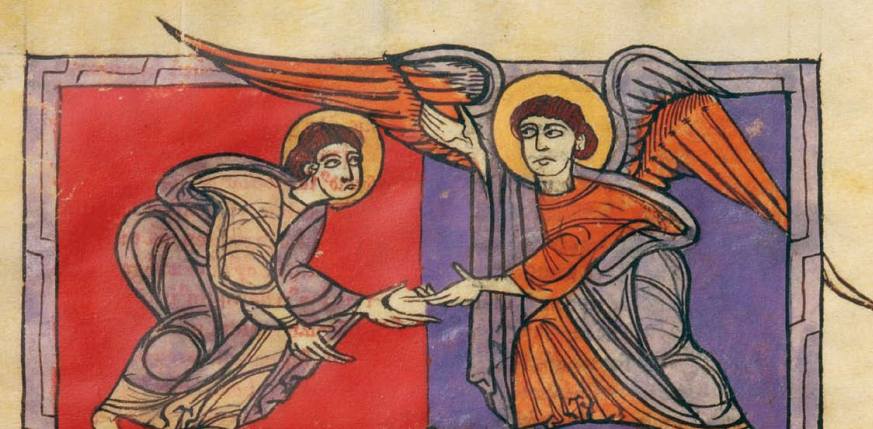 Florentius, altro miniatore, esprime la sua soddisfazione raffigurandosi col discepolo Sancius sotto l’omega conclusiva della Bibbia di Valeranica mentre brinda alla fine dell’opera].