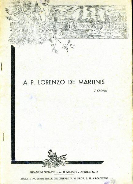 Padre Lorenzo tu ci hai lasciati. Ricordi... con volto lieto e tranquillo ti salutammo mentre ci impartivi l'ultima lezione. Tu partivi per Volturino il 24 marzo scorso e noi non pensavamo che era quella l'ultima volta in cui ci era dato ripeterti il nostro grazie per tutto quello che ci andavi prodigando. Il tuo sorriso e la tua paterna parola non torneranno più a risplendere e vibrare sul tuo volto impallidito e sulle tue labbra contratte dalla morte; questi cuori che ti amavano non troveranno più in te il Padre buono e amabile, il Padre intelligente ed esperto.