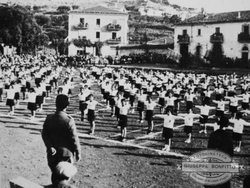 L'avvento del Fascismo è testimoniato da foto di cortei, saggi ginnici, apparizioni di note facce locali per l'occasione atteggiate a ghigni di pomposi gerarchi, e tanti scolaretti in divisa di Balilla. E c'è, soprattutto, l'Edifizio Scolastico (facciata anteriore e posteriore) la cui inaugurazione coincise con la mia quinta elementare.