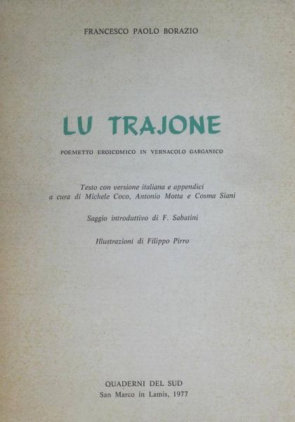 NOTTE FATATA Copertina de 'Lu Trajone' di F. P. Borazio'Dalli coppe la luna d'argente / sponta e 'nchiana schiarenne lu ciele / Trapuntate de stelle lucente / tale e quale 'nu mante de re / Dalli nuvela cala 'nu vele / trasparente, e, calanne, abburrita / de na luce gghiancastra pulita / lu cummente de Sante Matté. / / Com'è belle accussci setuate / 'nu castelle me pare che guarda / la defensa, li vigne, li prate / e 'gni cosa che 'nturne ce sta. / / Ma stanotte a quest'ora già tarda / cu sta luna che tutte l'ammanta / e li macchie e li prete t'incanta / ce reposa e 'nu sonne ce fa. / Dorme 'nzine allu monte Celane / ma la vadda la lana lu nanna / e la ninna li canta luntane / lu talorne che dice cucù. / / Pe' l'arietta che passa, li manna / svegliarine 'nu belle salute / a quest' ora: ha sentute, ha sentute? / lu jadducce fa cuccuracù. / / E lu vento che scioscia li fronne / alli cerre arracconta la storia / dell'antiche rumite, e chemponne / 'na canzona che è bella a sentì: / / 'Na canzona che canta la gloria / e li grazie de quistu cummente, / ma li note che vanne allu vente / li prufane non ponne capi'.