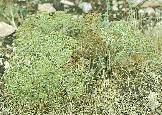Pianta erbacea perenne con fusto a base legnosa. Alta sino a 50-60 cm, molto ramificata tanto da assumere talora forma globosa o emisferica. Molto spinosa e di colore glauco in ogni sua parte.